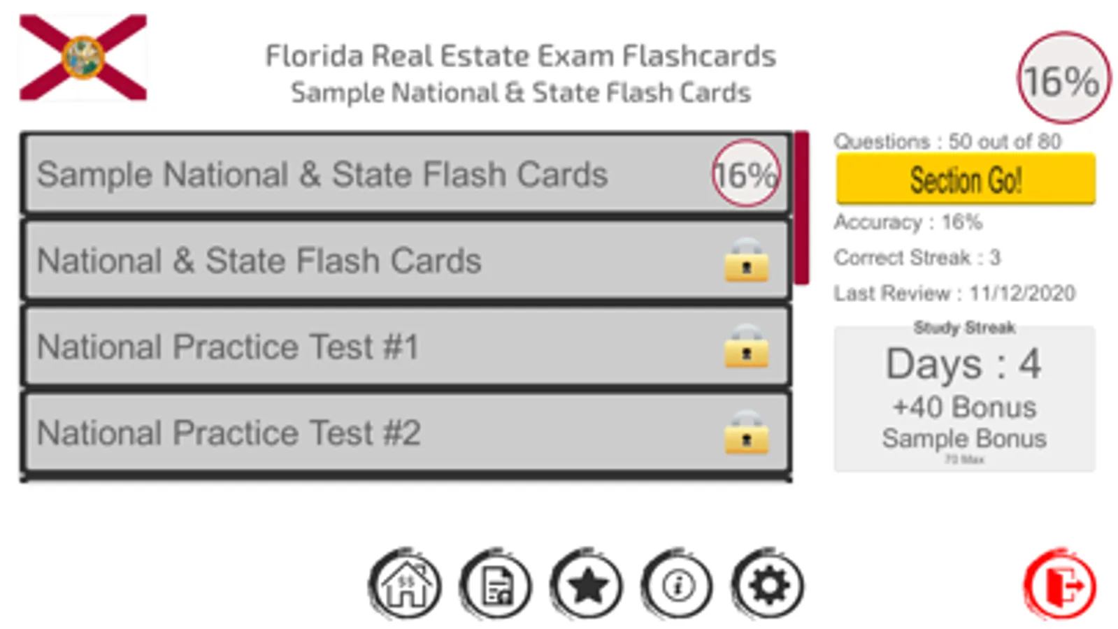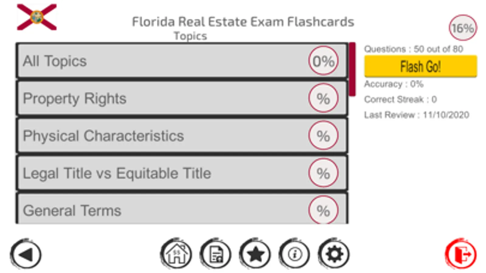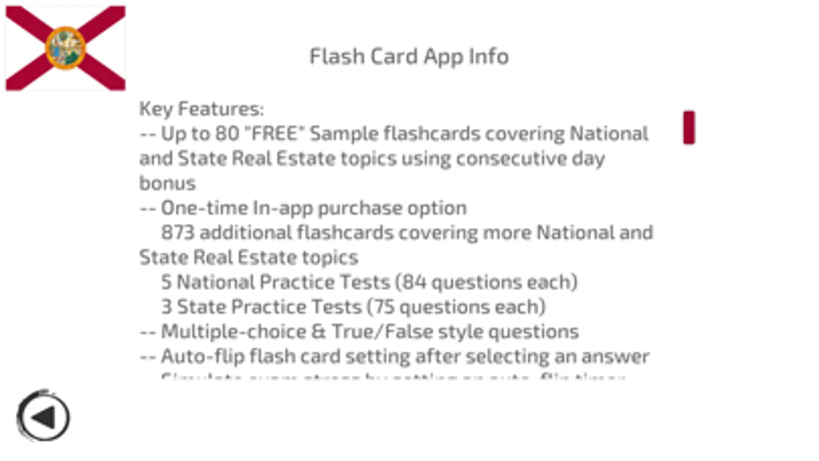 If you are preparing to take the Florida Real Estate Exam, this app should become your "take with you anywhere, I have an extra ten minutes" study guide. Better than a big book full of highlights and more user-friendly (and realistic) than paper index cards on an old 3-ring, this app combines big book knowledge into an on-the-go, take with you anywhere mobile application.