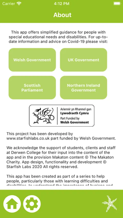 This app has been part funded by Welsh Government. Starfish Labs acknowledge the support of Welsh Government and Derwen College in the creation of this app. All imagery, graphics, voice content, workflow system and development © Copyright Starfish Labs 2021.