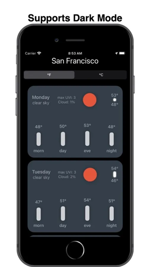 It shows a beautiful and intuitive user interface which allows you to understand the current weather condition and the weather forecast for the rest of the day and for days ahead in a glance.