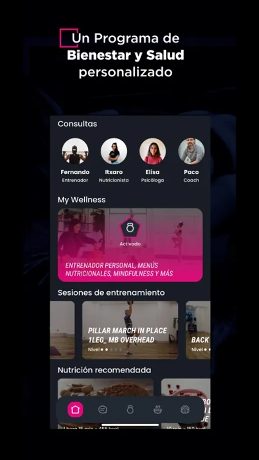 Además, disfruta de clases on-demand de fitness, yoga, estiramientos y otros deportes, junto a tips de nutrición, menús nutricionales saludables y entrenamiento psicológico.