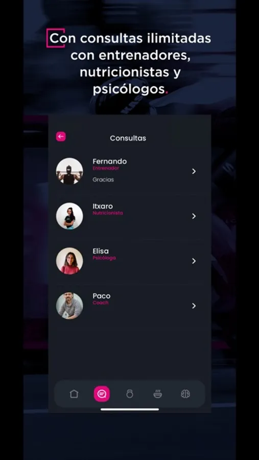Podrás hacer todo tipo de consultas a nuestros entrenadores, nutricionistas, psicólogos y coaches.