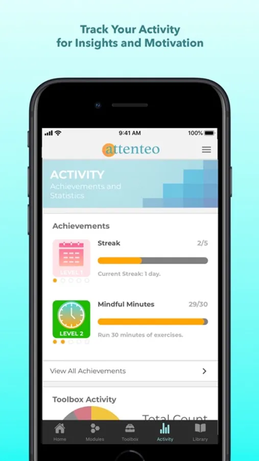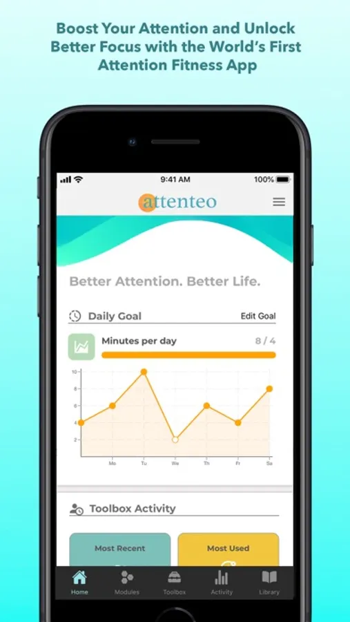 Our unique approach to Attention Fitness™ sets Attenteo apart as the ultimate attention training app. By enhancing your understanding of your attention and equipping yourself with tools and techniques for everyday life you can beat stress, stay focused, and more easily achieve your goals.