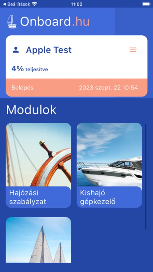 Az Onboard alkalmazás egy innovatív, hajózással kapcsolatos elméleti vizsgára felkészítő rendszer. A teszt alapját az ITM által hozzáférhető hivatalos hajózási hatósági vizsgakérdések adják, melyek a tanulást és az azt követő sikeres elméleti vizsga letételét segítik elő. Az alkalmazás a Hajózási szabályzattal, kisgéphajóval és a vitorlás kishajóval kapcsolatos több ezer teszt kérdést és hozzájuk tartozó segédletet, magyarázatot tartalmaz. Tanuló üzemmódban lehetőség van a kérdések témakörök szerinti áttekintésére, hozzájuk tartozó segédlet, magyarázat feldolgozására. Gyakorló üzemmódban a rendszer segít megtanulni a helyes válaszokat, mindezt adaptív módon. Vizsga üzemmódban pedig vizsgaszimuláció végezhető, melynek végén egy részletes kiértékelés segít a felkészülésben. Részletek: onboard.hu