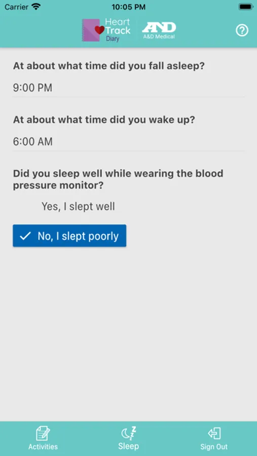 This A&D Heart Track Diary app allows you to record your observations during an ambulatory blood pressure study, such as daily activities, sleep time, and sleep quality. These observations are transmitted securely to your clinician, allowing them to quickly and easily contextualize your blood pressure measurements and increase the accuracy of your ambulatory blood pressure study.