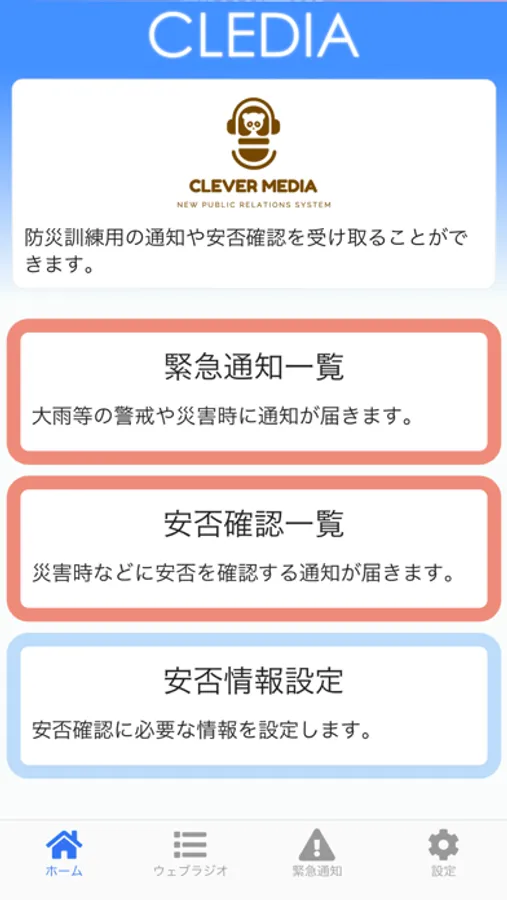 防災訓練用を支援するための、参加者へのウェブラジオ配信や、緊急通知・安否確認を行うアプリです。