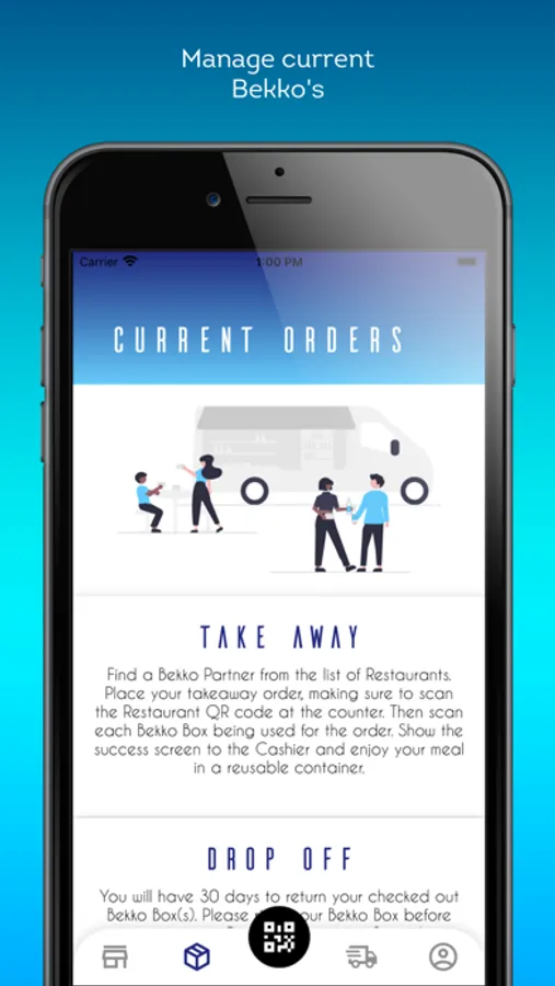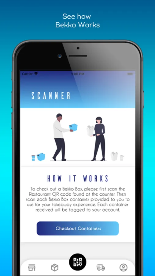 Each Partnering Restaurant will have a custom QR code, found at the cash register. Simply open the Bekko Box App, scan the QR code then enter in the number of Bekko Box’s being checked out for the current order. Show the Restaurant Team Member the success screen, and get your food to go in a Bekko Box today!