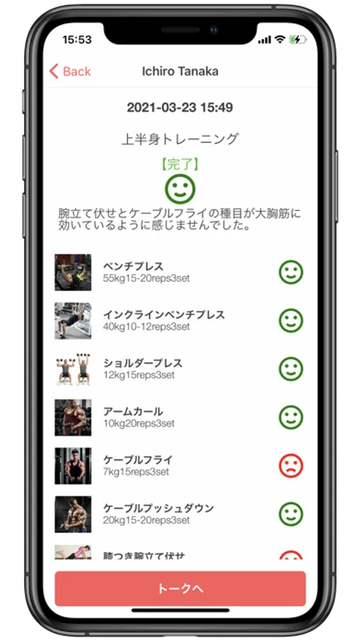 ■トーク機能 チャット形式のトーク機能で、クライアントと円滑にコミュニケーションしましょう。トレーニング内容、スケジュール、食事などについて気軽にやり取りできます。 ________________________________