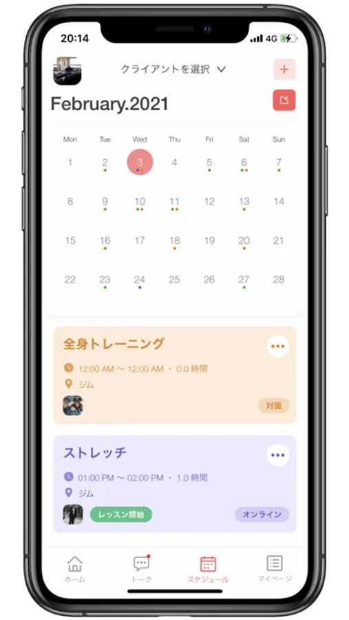 ■スケジュール管理機能 クライアントのスケジュールを一括管理。ホームワーク、オンラインレッスン、対面レッスンをまとめて表示して、クライアントのトレーニングを効率よく管理することができます。