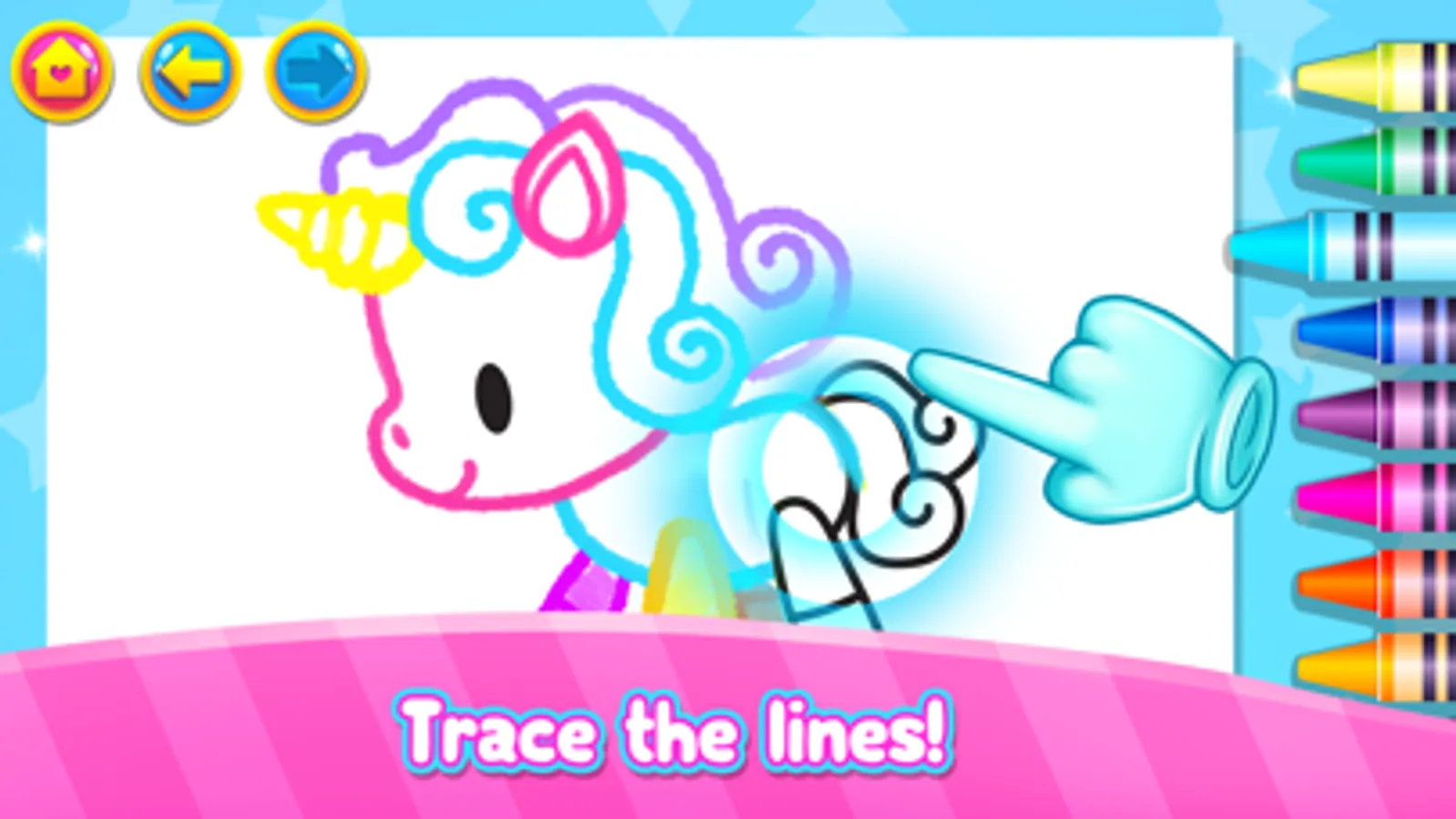 Use glitter crayons, and trace the lines one by one, until you create your very own beautiful picture! Watch your character animate and play after you're done drawing!