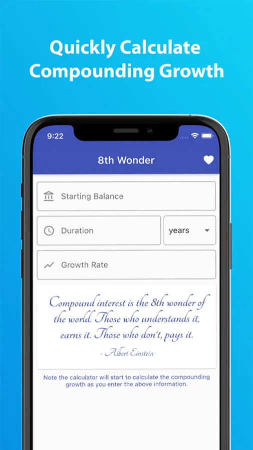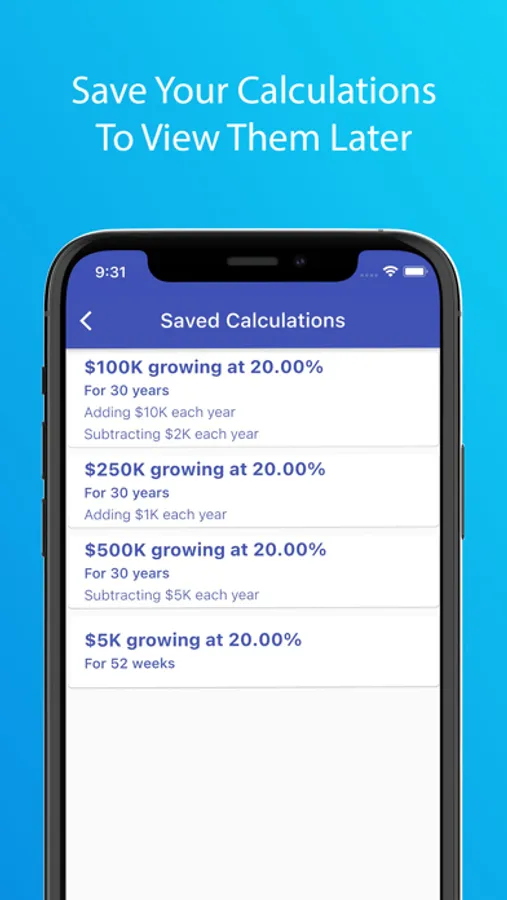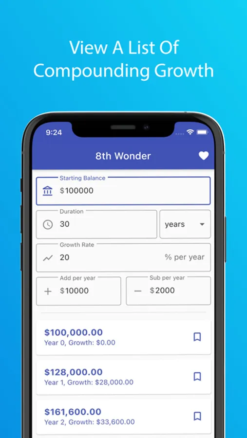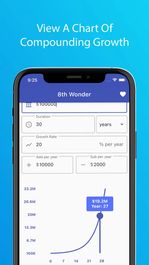 8th Wonder lets you enter a starting balance (principal amount), duration (days, weeks, months, quarters, or years), growth rate (interest rate), and the ability to add or subtract specific amounts each period to calculate a compounded growth list or chart. The app then lets you view your compounded list or chart based on the calculations instantly. Moreover, you can save your calculations for future viewing as well.