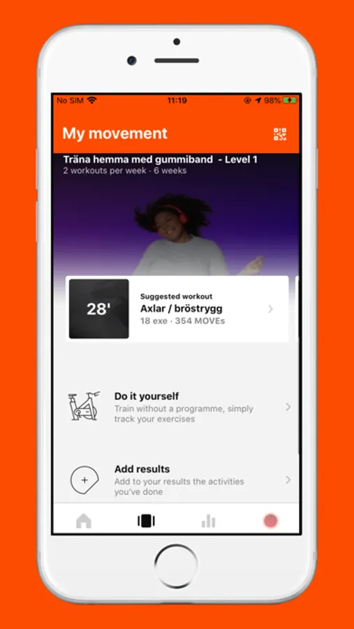 Een virtuele coach die u begeleidt tijdens uw training: Kies eenvoudig de training die u wilt doen in de Mijn beweging pagina en laat de app u begeleiden tijdens uw training. De app gaat automatisch naar de volgende oefening en geeft de mogelijkheid om uw training een waardering te geven en een volgende training in te plannen.