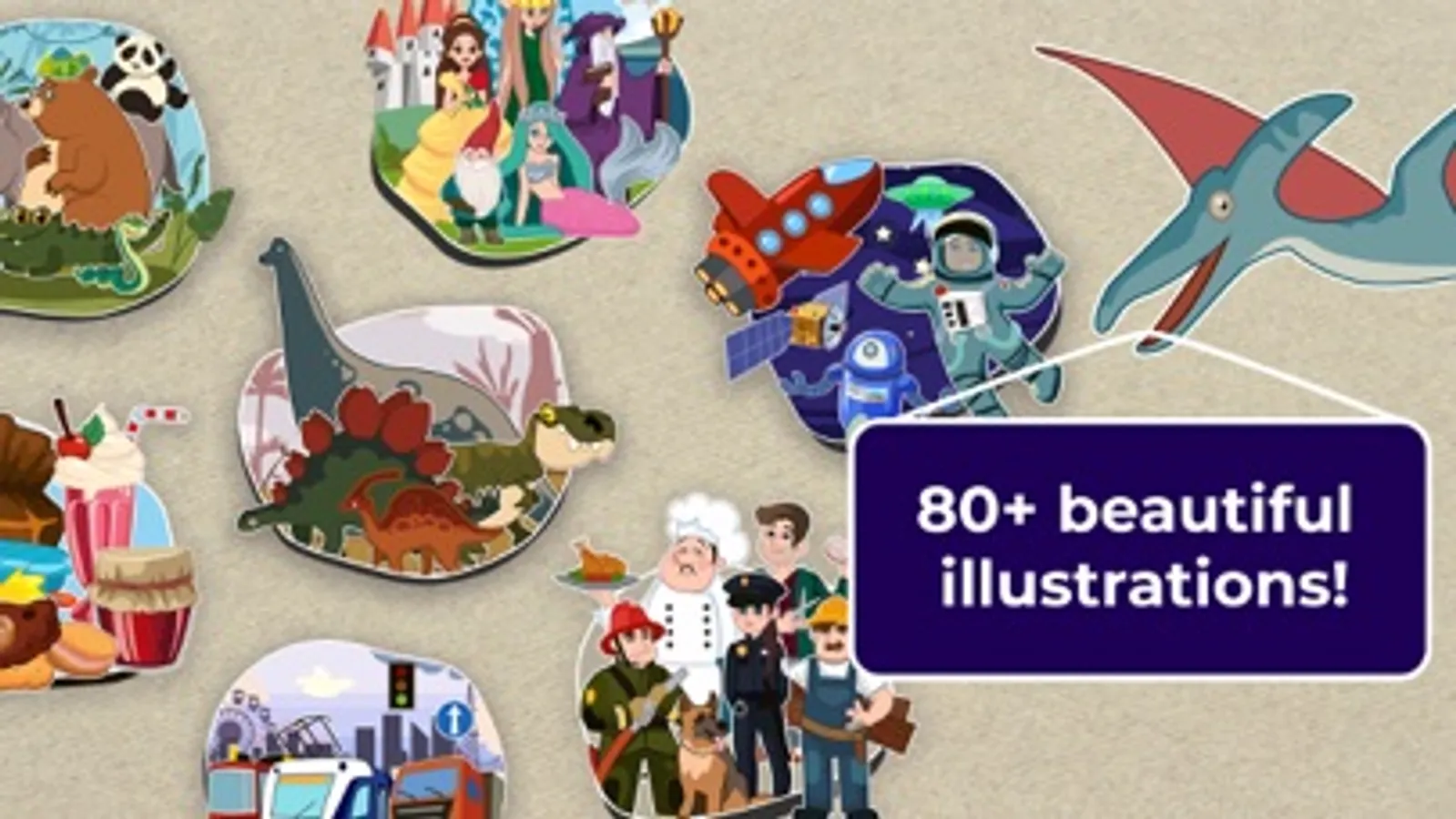 • 7 topic packs: Animals, Dinos, Fairy Tales, Professions, Transport, Space, Sweets