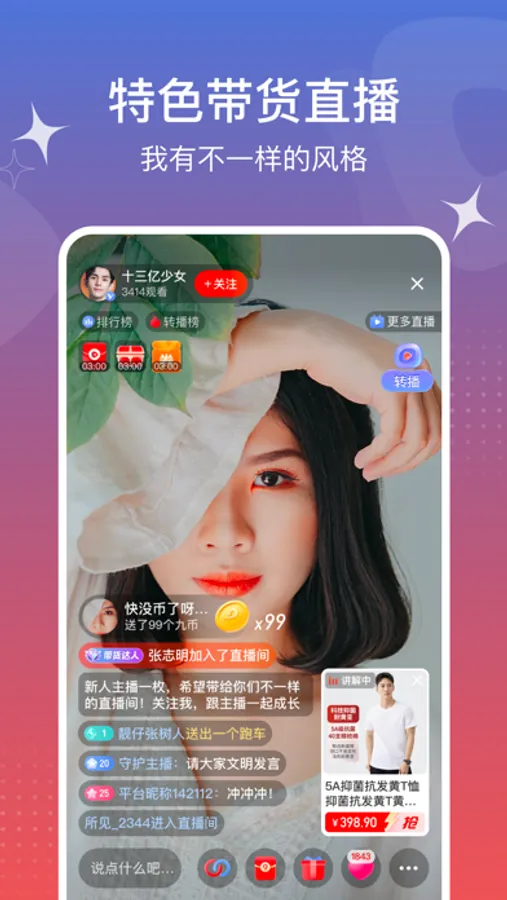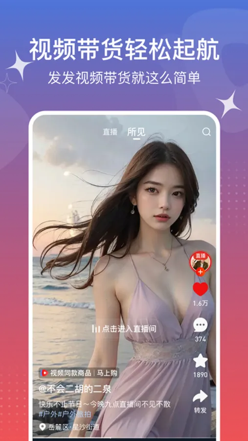 【直播带货】商家直播带货,边直播边推荐精选好物,限购、秒杀、包邮、橱窗、客服等丰富购物功能让商家卖得方便、让用户买得放心。