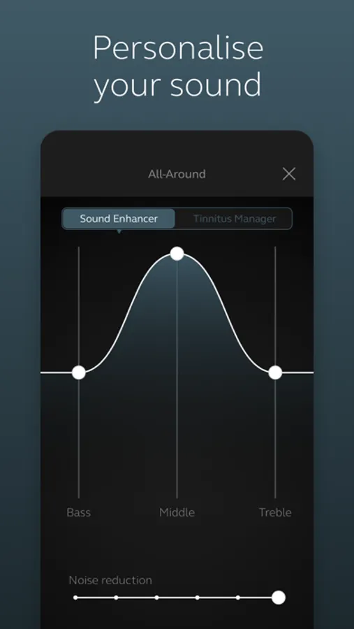 • Tinnitus manager: Adjust sound variation and frequency of the Tinnitus Sound Generator. Select Nature Sounds (feature availability depends on your hearing aid model and the fitting by your hearing care professional)