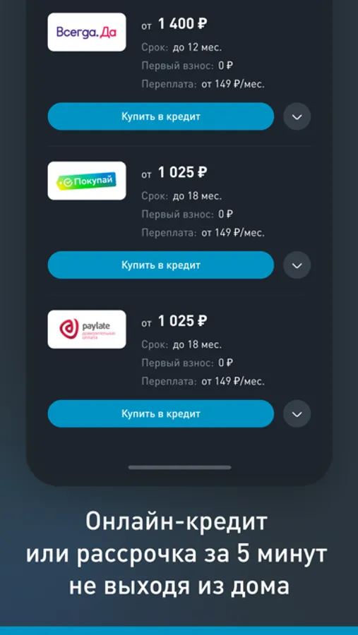 Оформляйте множество товаров в рассрочку или кредит прямо в приложении. Позвольте себе больше.