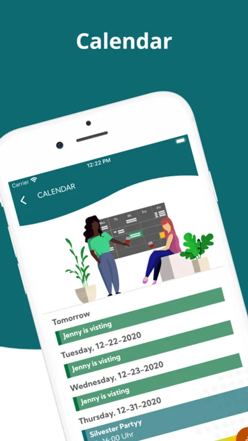 FlatUp! provides you a shared calendar, where you can enter events, absences, visitors or birthday reminders.