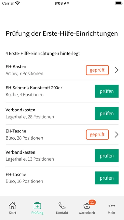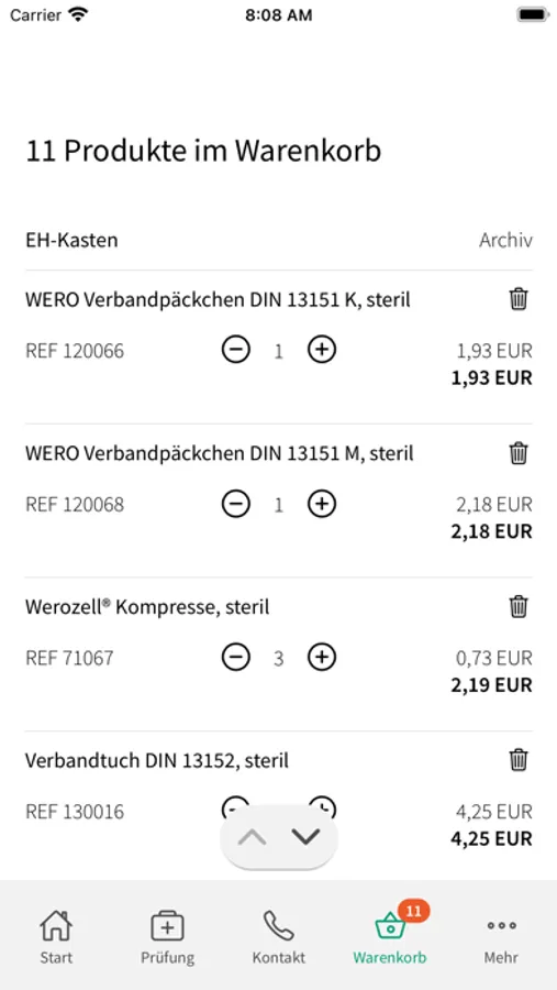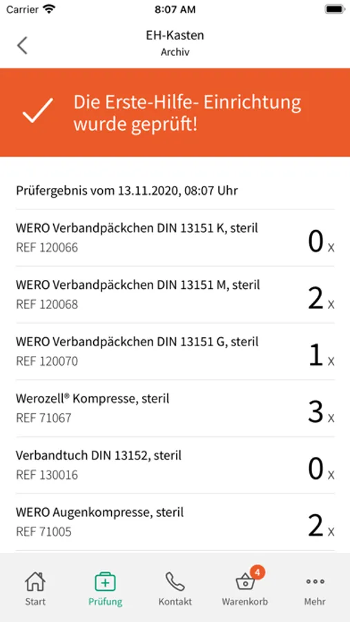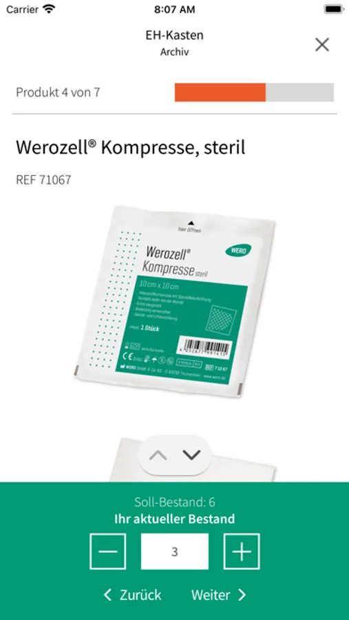 Den Bestand Ihrer Erste-Hilfe-Einrichtung können sie manuell eintragen oder alle vorhandenen Produkte einscannen. Dadurch errechnet die App, welche Produkte Sie nachfüllen sollten und fügt diese automatisch dem Warenkorb hinzu.