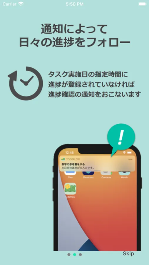 また、決められた時間までに進捗の入力がない場合は入力を促す通知を表示することができます。