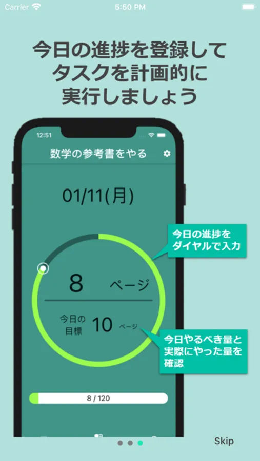 進捗を管理したいタスク(例:とある本を読む、問題集を1冊やり切る...など)を設定すると、1日あたりにどれだけのページ数分進めないといけないかがわかるようになります。