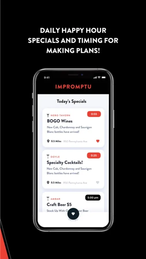 Impromptu offers drink and food deals at your favorite local bars and restaurants in real time. It is free to use. Simply download the app and see which of your favorite spots around town are offering deals right now. Once you open the app you will see a list of spots offering deals to you by proximity to your current location. Head to the location in a certain amount of time and show the bartender your redeemed deal and enjoy a discounted drink. It’s that simple!
