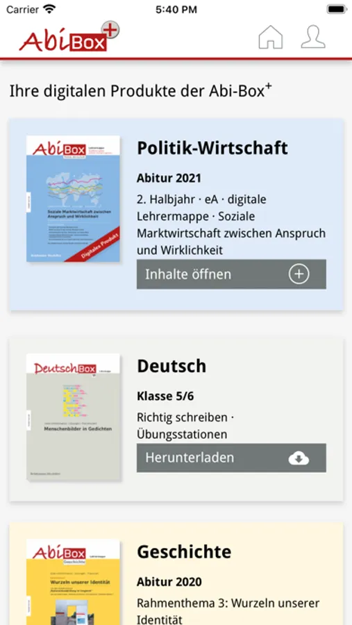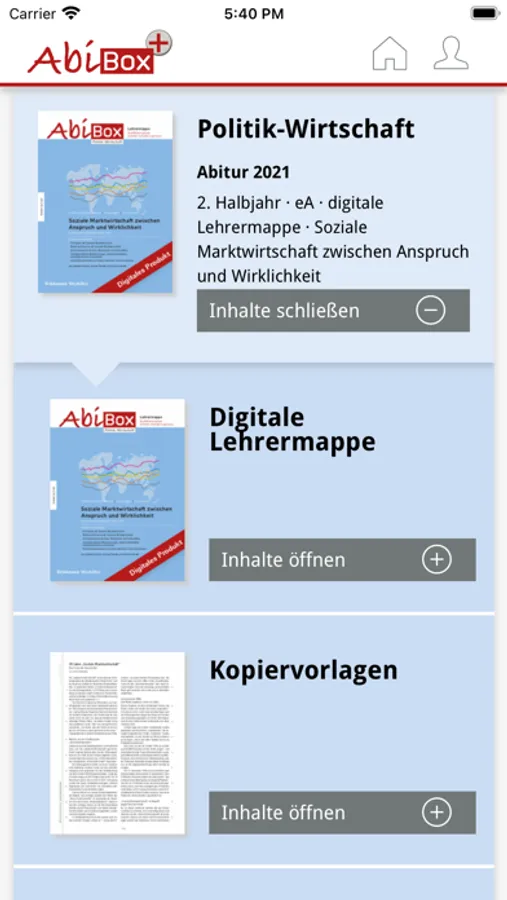 Laden Sie sich Ihre digitalen Produkte der Abi-Box in die Abi-Box+- App herunter und sichern Sie somit Ihre optimale Unterrichtsvorbereitung und -durchführung. So haben Sie jederzeit und von überall Zugriff auf die digitale Lehrermappe und die enthaltenen Unterrichtshinweise und Musterlösungen zu allen Aufgaben des Schülerarbeitsbuchs.