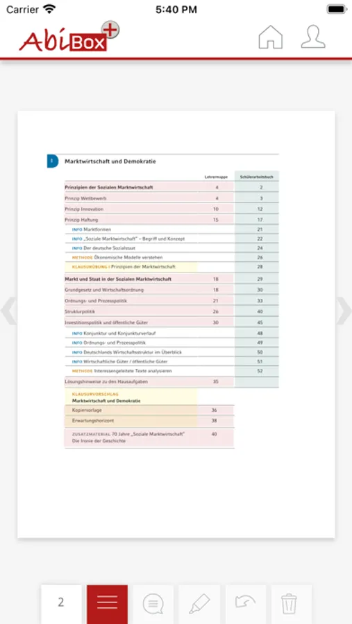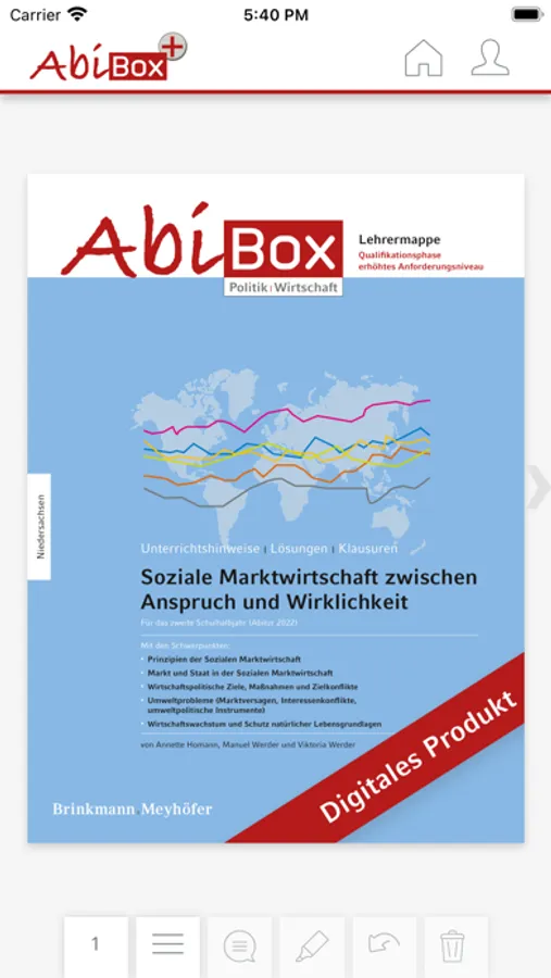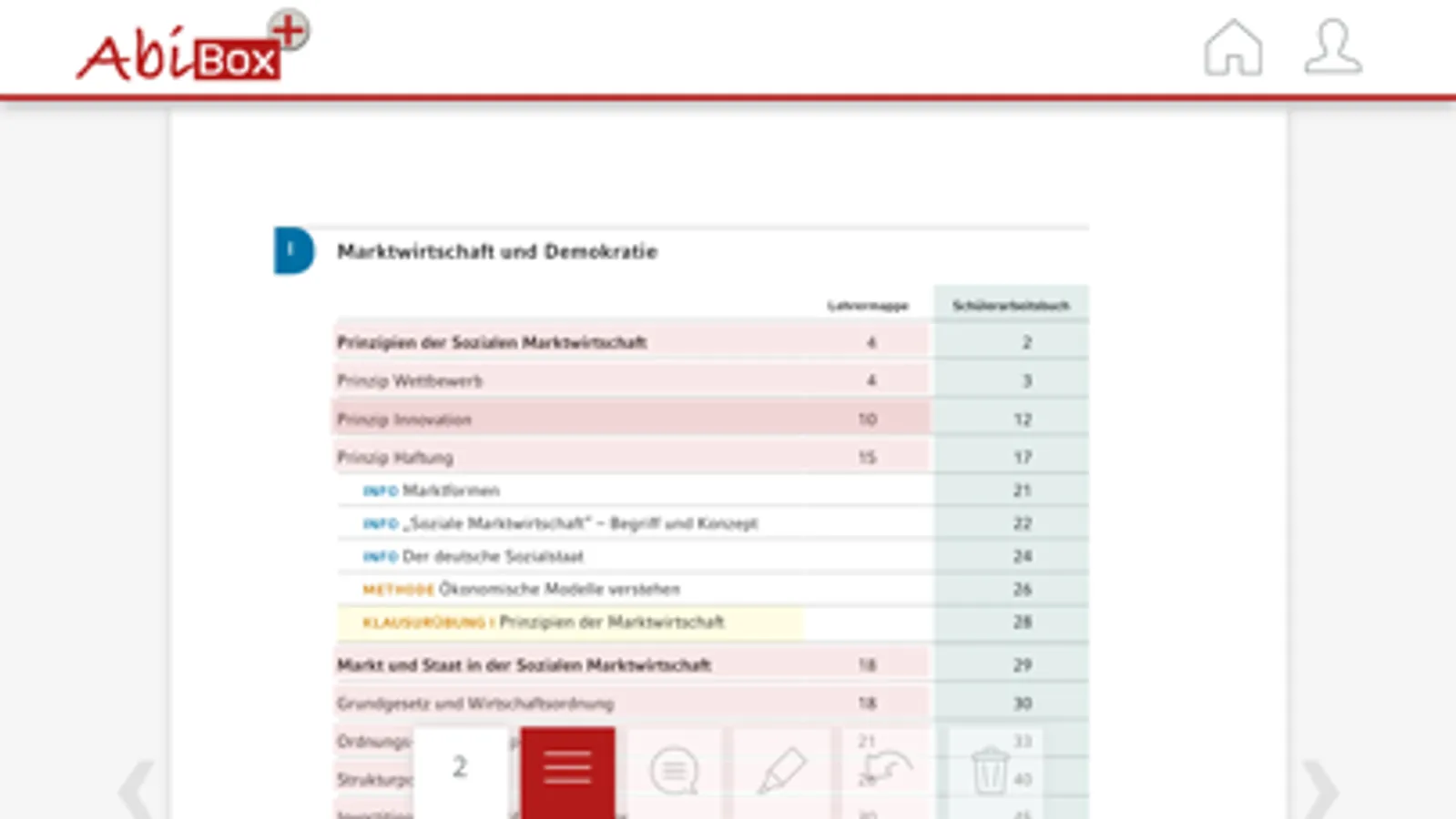 Über das interaktive Inhaltsverzeichnis oder die Eingabe einer bestimmten Seitenzahl gelangen Sie einfach und schnell zu den gewünschten Seiten in Ihrer digitalen Lehrermappe. Außerdem haben Sie in der Abi-Box+-App die Möglichkeit über Bearbeitungsfunktionen wie Markierungen, Zeichnungen oder Notizen Ihren Unterricht vorzubereiten. Ihre in der digitalen Lehrermappe individuell hinzugefügten Bearbeitungen werden automatisch abgespeichert und auf Ihren verschiedenen Endgeräten synchronisiert. Neben der Möglichkeit des Wechsels zwischen Hoch- und Querformat auf Ihrem Endgerät und dem Wechsel zwischen Doppel- und Einzelseitenansicht ist das Zoomen an spezifische Aufgaben oder Abbildungen ebenso möglich. Eine optimale Darstellung ist somit jederzeit gewährleistet.