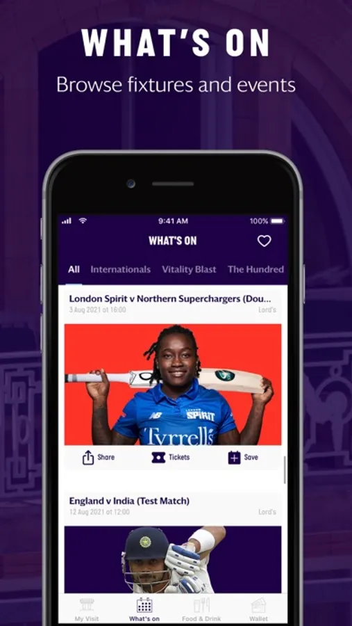 Access your matchday tickets through the Official Lord's app. Attending in a group? Quickly and easily transfer your tickets to friends and family through the in-app transfer function.
