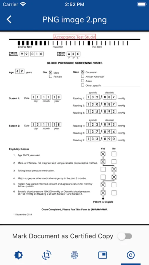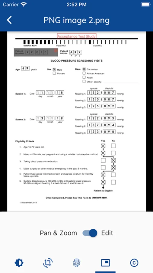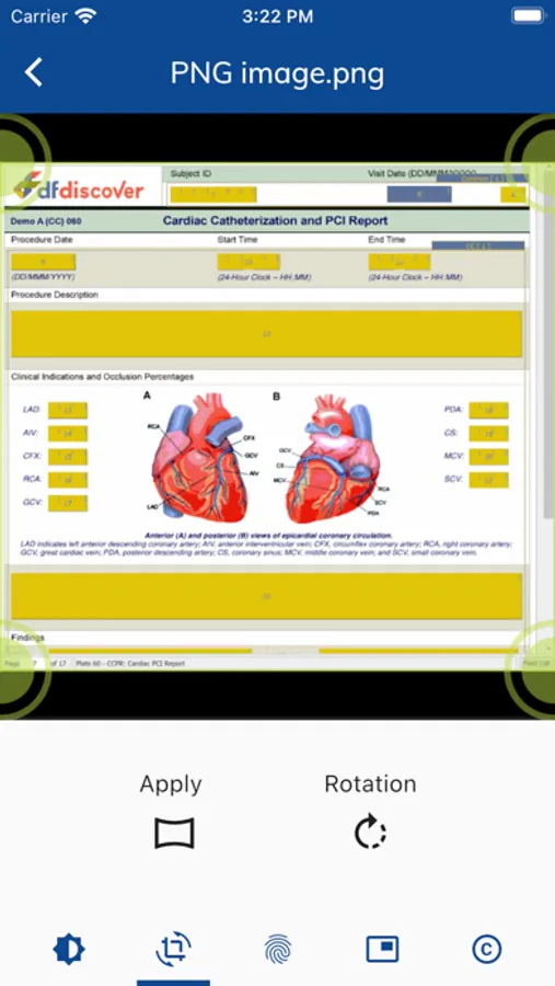 Existing documents (PDF, PNG, JPG, DICOM, MP3, etc) can be added from local storage or by taking photos of paper documents. Once in DFsources, documents can have standard transformations (brighten/darken, rotate, skew) applied to them. User controls for redaction and certification are available. After study identifiers are applied, documents are sent directly to the DFdiscover study and attached as specified. Documents are immediately available for viewing in DFdiscover.