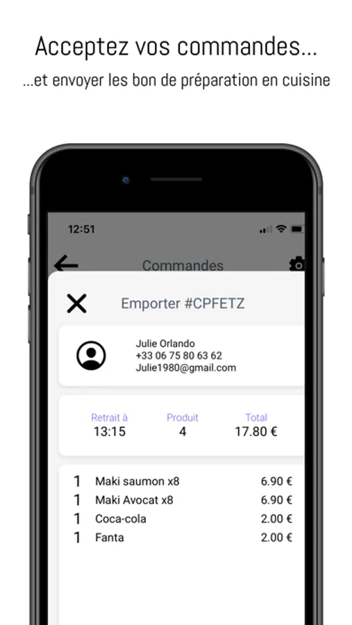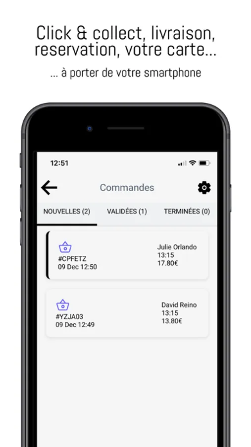 Recevez et gérez vos commandes en Click and collect, Livraison en propre sur votre application. Confirmation, en cours, annulation, impression du bon de commande.