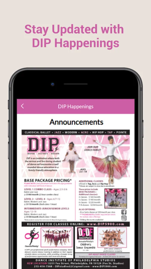 DIP (Dance Institute of Philadelphia) is located in the historic section of Germantown in Philadelphia, PA. Our dance school provides quality dance training through 3 main programs: DIP - the main dance school, DanceInPhinity! - our pre-professional Youth Performance Company and DCDE - DanceInPhinity's Children's Dance Ensemble.