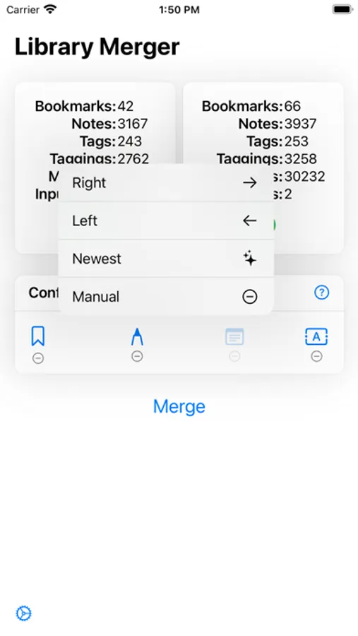 The Library Merger allows you to quickly and easily combine two JW Library® backups into one. Simply open both backups in the app (you can even send them via AirDrop). The app will merge them into one. If it finds a conflict (like two bookmarks at the same place, or two markings that overlap), you can choose which version to keep. In the end, you have one merged backup which you can easily restore on your devices. The process - if done regularly - literally takes you seconds!