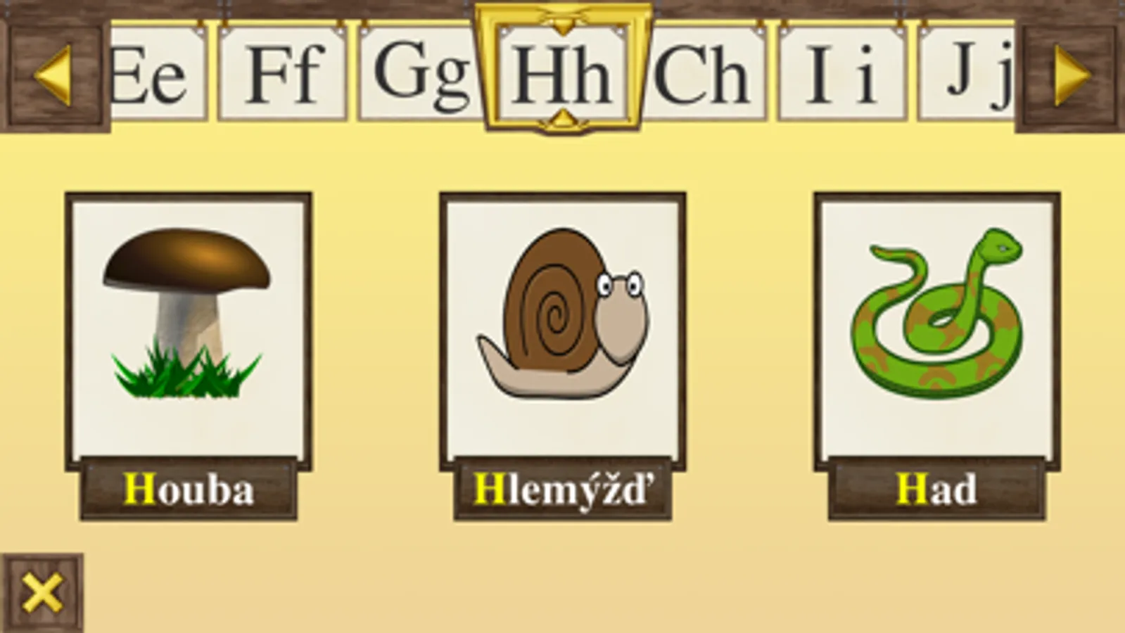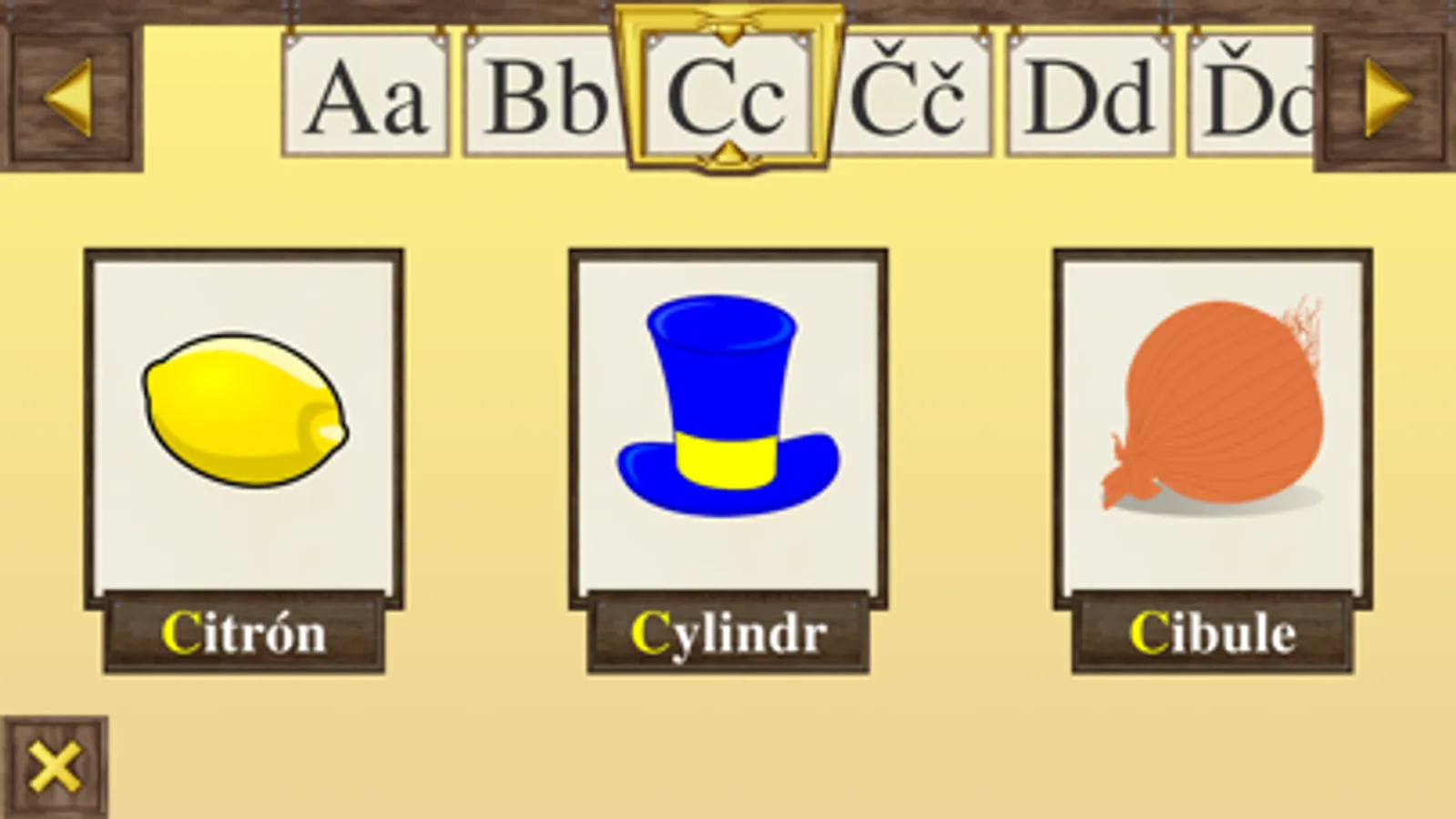 a obsahuje dvě scény, v první je možné procházet písmenko po písmenku a ke každému písmenku existují 3 obrázky, které začínají stejným písmenkem.