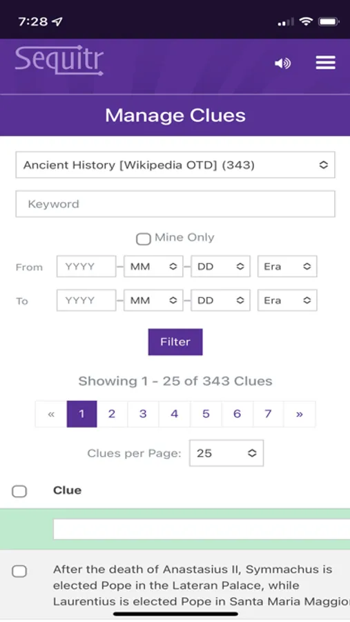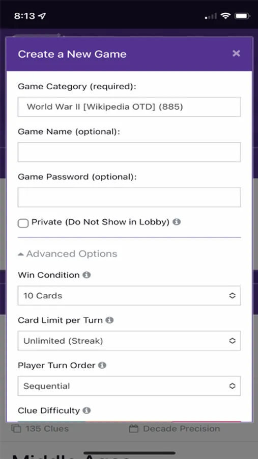 Customize your games with victory conditions, difficulty levels based on the historical ratio of correct guesses, and community-voted clue quality scores. The date precision can also be fine-tuned to adjust how accurate guesses need to be to be considered correct.