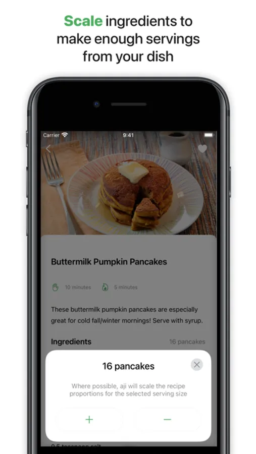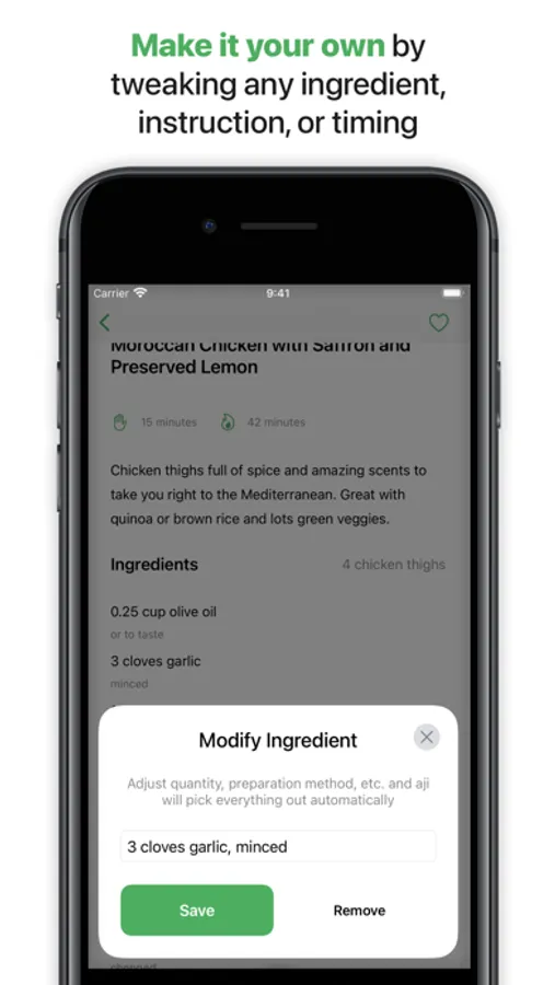 Cooking is always to your palate and recipes should only serve as a guide - aji understands this, and can modify any part of a recipe with a single tap. Time in the oven doesn't doesn't take as long? Reduce the cook time! Dislike onions? Take them out!