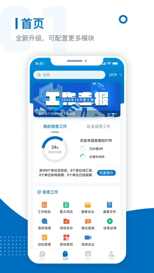 以简洁、易用为主题,可视化呈现工作相关的主要内容,直观表达主要信息。各不同角色都可以一目了然地了解自己所分管、负责的事项的动态,以便及时作出处理,比如批示、督办、反馈情况、上传图片文件等。