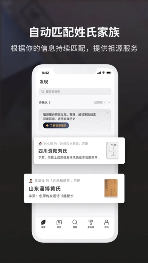 -发现:系统根据已有信息自动匹配推荐家族线索,快速找到你的家族
