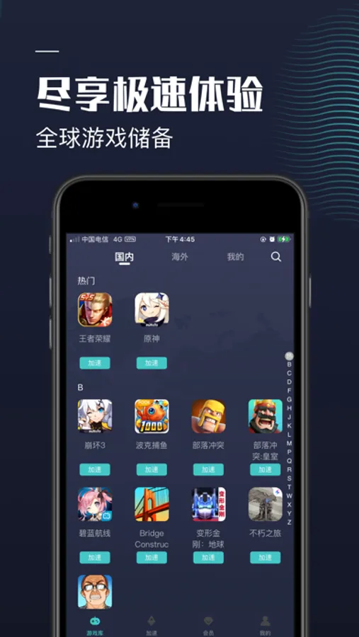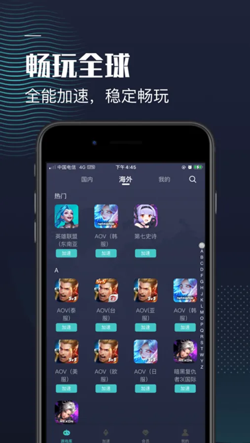 支持美服、亚服、日韩服、港澳台服、东南亚服、国际服等海外区服加速,与海外玩家轻松联机,玩转海量手游!