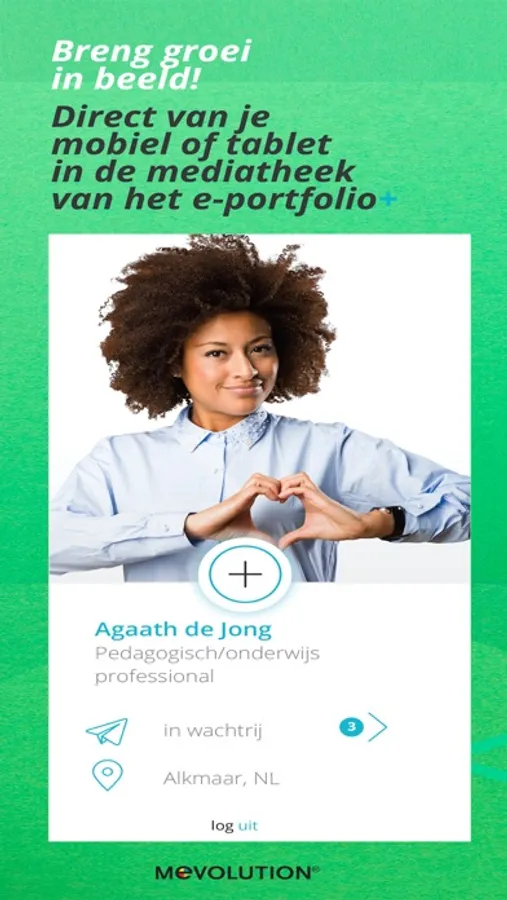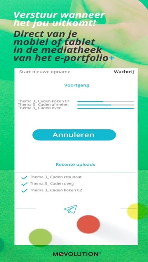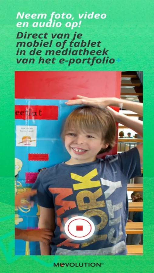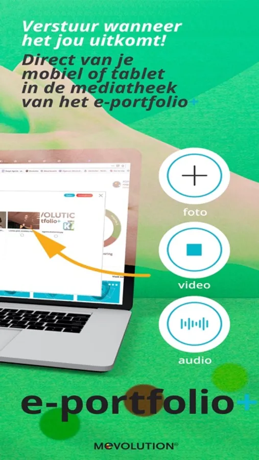 Met de app kun je snel foto’s, video’s en audio-opnames maken. Je kunt ze met maximaal 20 tegelijk uploaden naar jouw online Mediatheek in je Mevolution e-portfolio+. En van daaruit kun je ze verder distribueren naar de e-portfolio’s van één of meer kinderen en andere betrokken.