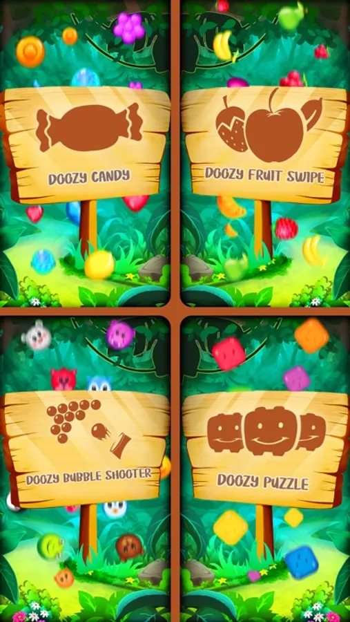 Welcome to Doozy Land, a world of sweetness and magic, where we have put together the 4 most popular head-to-head games in one. You will be swallowed up in the amazing DOOZY LAND with BUBBLE SHOOTER, FRUIT SWIPE, PUZZLE and CANDY. In each of the 4 games, you will, among other things met by small tasks you have to solve. At each level, it gradually gets harder. You can get help from the special BOOSTERE and POWER-UPS.