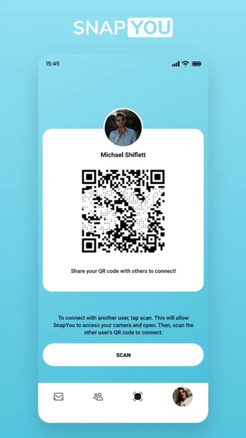 To connect with a new person, simply pull up your QR code on your phone. Your new friend will then have to open the SnapYou app on their phone and scan your code – and that’s it!
