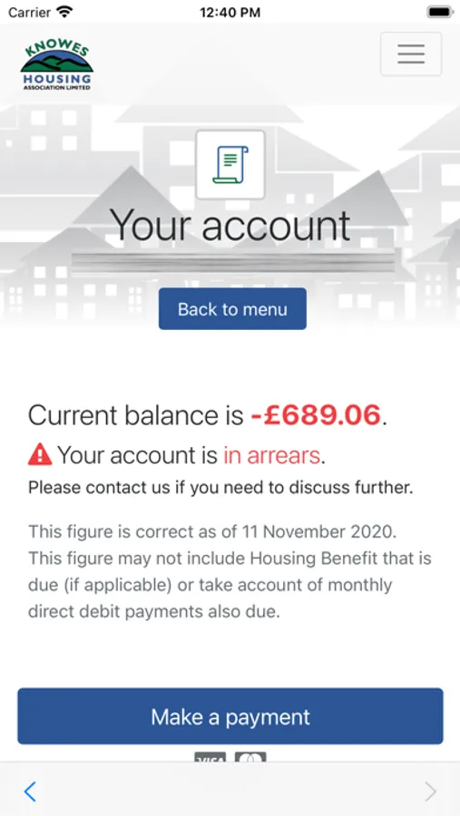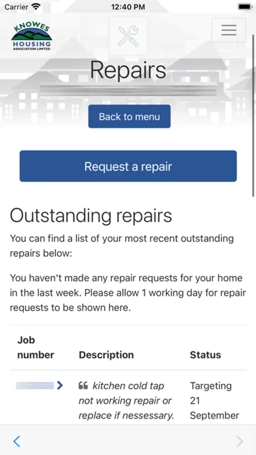 Our self-service portal app lets you manage your housing tenancy with Knowes Housing. You can do things like request a repair or inspection, report anti-social behaviour, check your account statements and mini statement, pay your bill, and much much more.