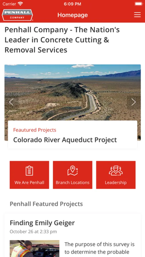 The Penhall Company app is the communication tool for Penhall. Penhall Company is the largest provider of concrete cutting, concrete breaking, excavation and grinding services in the United States. The Penhall Company app keeps you up-to-date with information and news about Penhall Company and its subsidiaries. Download the Penhall Company app to find out about job openings, educate yourself about our Leadership team, or simply find out about our latest projects!