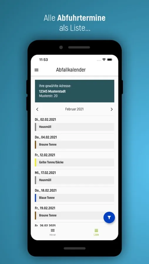 Mit dieser App können Sie den Abfallkalender Ihrer Kommune abrufen. Nach der Auswahl Ihrer Adresse, sehen Sie in einer übersichtlichen Ansicht alle Abfuhrtermine. Außerdem können Sie die Abfallarten nach Belieben filtern und sich zu allen Terminen benachrichtigen lassen.