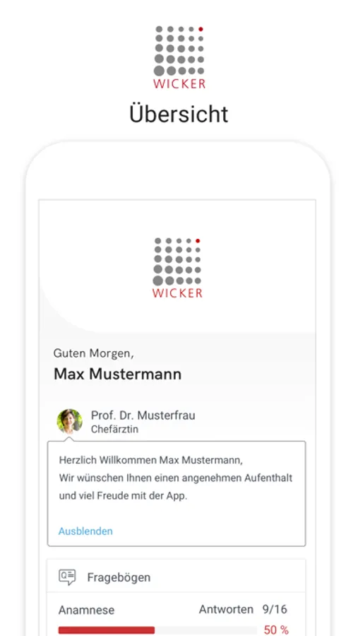 - Fragebögen und Checklisten, die Sie bequem online ausfüllen können Als Patient der Wicker-Kliniken können Sie die App nach Anmeldung jederzeit auf Ihrem Smartphone nutzen.