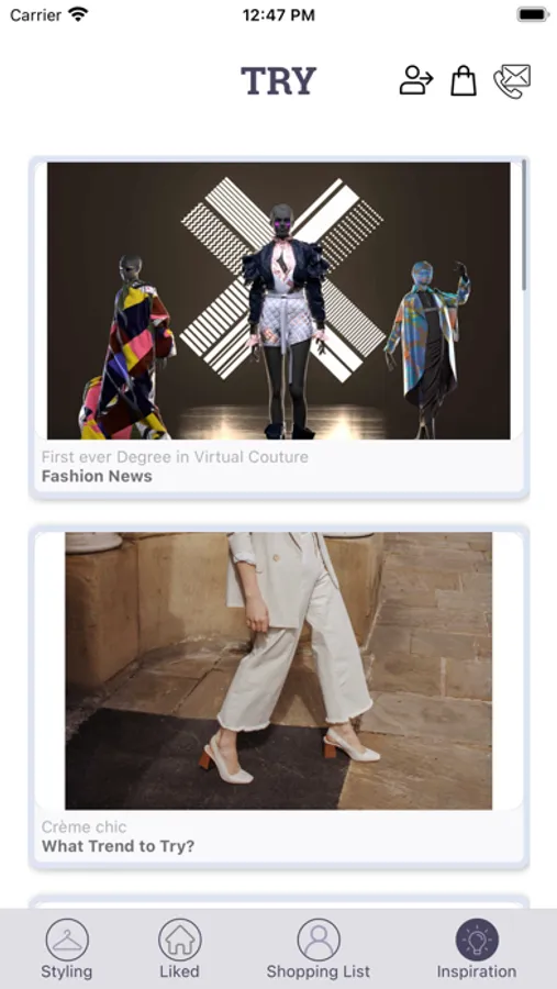 TRY is a personal stylist & seasonal shopper app where all the outfits are hand picked following the latest trends, body proportions and colour combinations. Every week you will be able to see a new set of outfits coming your way.