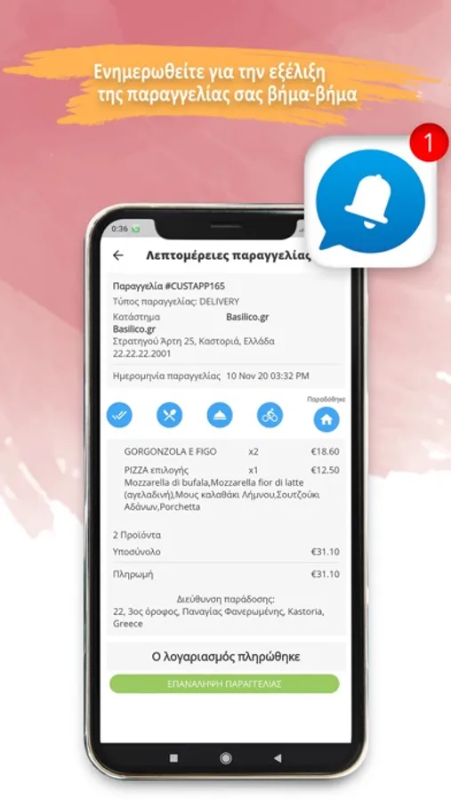 •Παρακολουθήστε την εξέλιξη της παραγγελίας σας βήμα-βήμα (Push Notification)