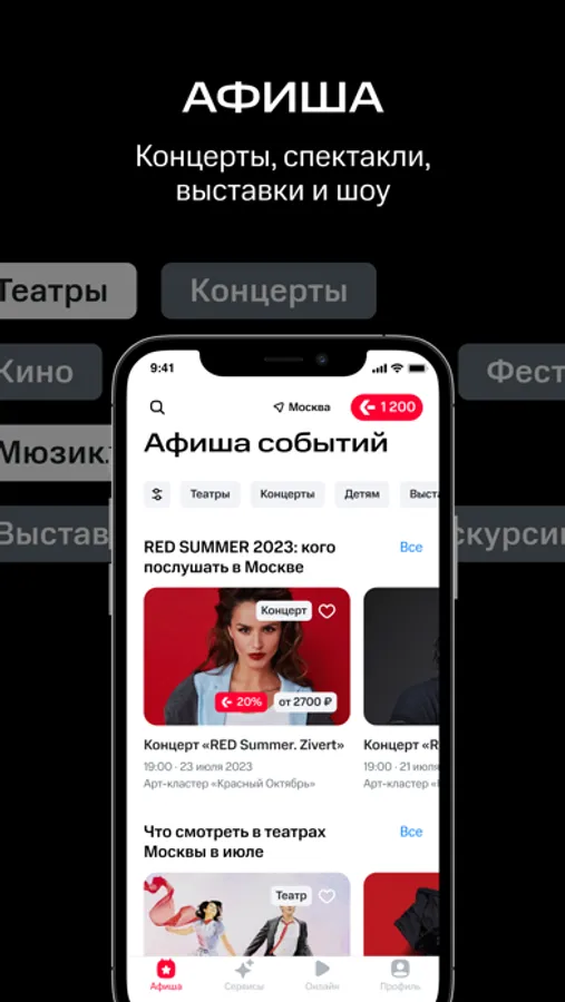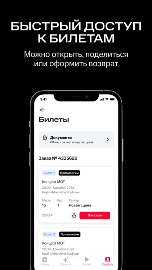 Смотрите подборки в разделе «LifeStyle» и находите интересные мероприятия для свидания или отдыха в выходные. Купленные билеты хранятся в самом приложении — вы не потеряете их и не забудете дома.
