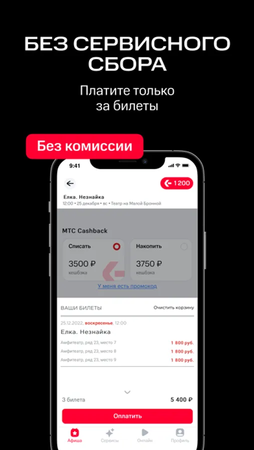 С приложением МТС Live вы не переплачиваете за билеты на развлекательные события. Никаких наценок или сервисного сбора — только цена билета. А после события вас ждёт щедрый кешбэк.