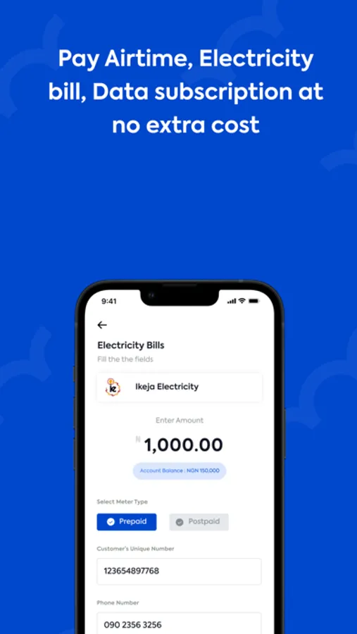 - Bill payments - Pay for airtime, Electricity bill, Internet Data Subscription, etc at no extra cost.