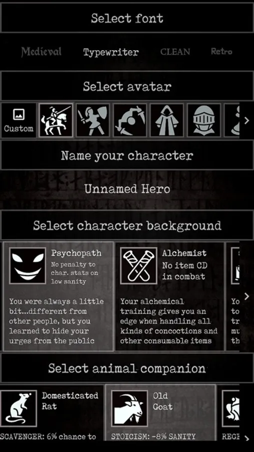 - select one of 27 character backgrounds that each affect gameplay in a different way